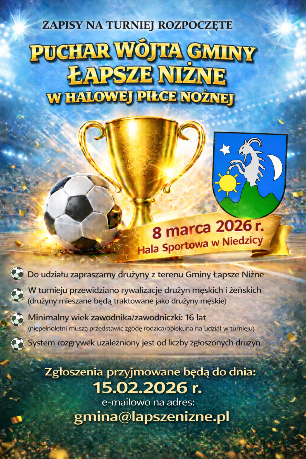 Zgłoszenia przyjmujemy do 15 lutego 2026 r. na adres: gmina@lapszenizne.pl (HALOWA PIŁKA NOŻNA)