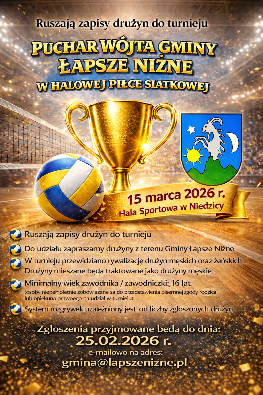 Zgłoszenia przyjmujemy do 25 lutego 2026 r. na adres: gmina@lapszenizne.pl (HALOWA PIŁKA SIATKOWA)